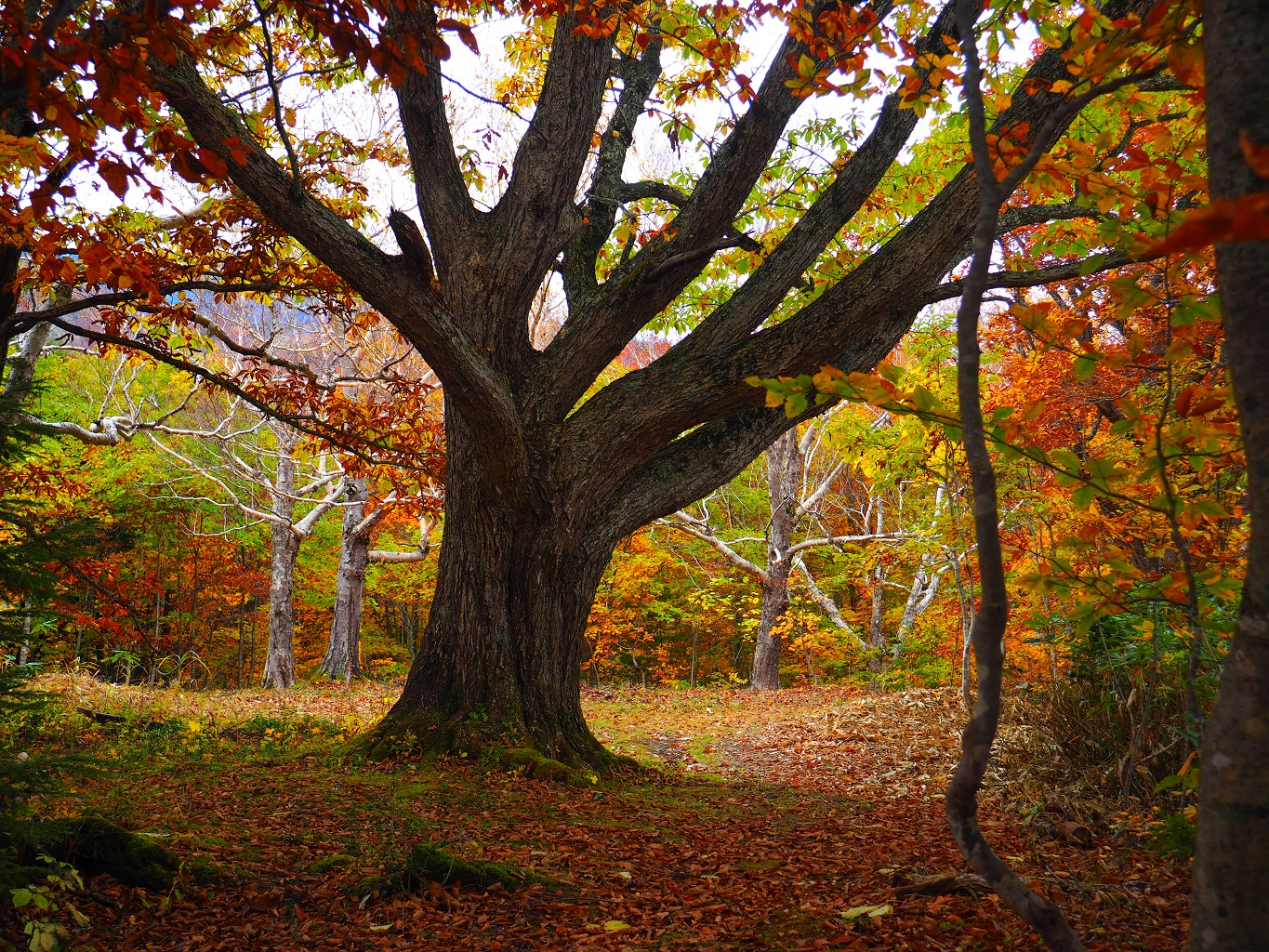 すきとおった冷気が地上に降り 冷え込むようになった秋の朝 山道には霜柱が立っている 枯草に囲まれた道が 夜明け前に霜の妖精が歩いたため白くなっている ぶどう色に枯れたナワシロイチゴの葉には ドーナツにふりかけたパウダーシュガーのような霜 ブナの森に入ると木の後ろから朝日が差して 金色に輝くゴールデンロード ここは祈りのような静けさにつつまれた聖なる森 森の中の道を外れた所で グランドマザーツリーが悠久(ゆうきゅう)の大地を見守る ブナの森を登りきると 青い空の下 白樺と楓の道 秋の山道は 赤 黄 オレンジの光があふれる色の洪水 リンドウの紫色が枯れた草むらのアクセント 大きな木に出会うと 荘厳な気配を感じる そして ガジュマルの木のようにキジムナーか あるいは トトロがいるのではと なんだかゾクゾクするような楽しい気分になる 大きな木には、幾星霜の風雪に耐えた風格と威厳がある それと どっしりとした安定感からくる安らぎが 公園では高原よりも少し遅れて紅葉が始まった 遊歩道沿いの並木で紅葉する楓 芝生に落ちた赤や黄の楓 夕方の残光に金色に輝く楓 農村の道を歩いていつも感心させられるのは 道に沿って植えられた花 春は水仙 夏はダリア 秋は菊 軒下に大根を干している家もある (2020/10/31)