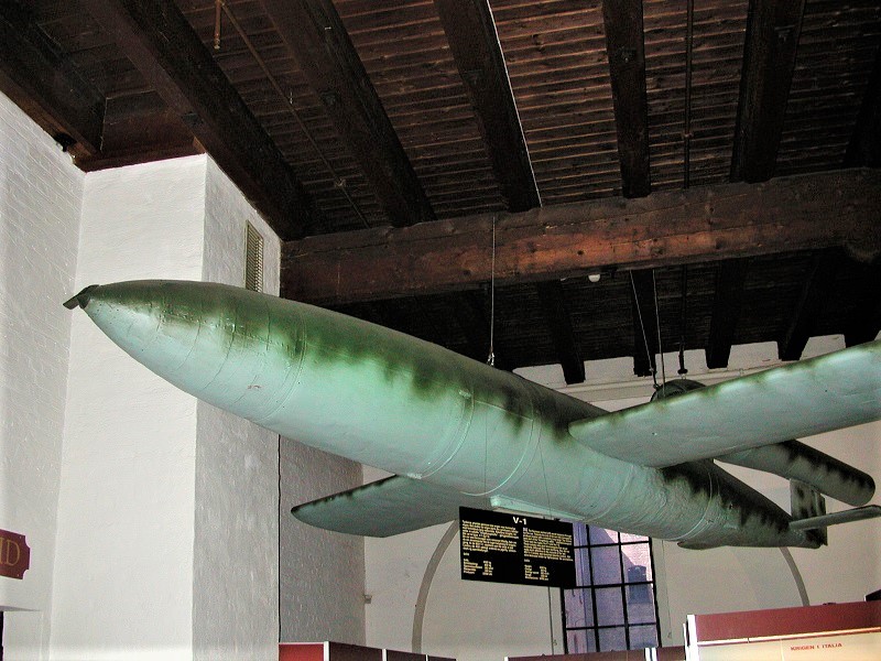 レジスタンス博物館を出て、建物の外置かれた旧式の大砲を見ながら、広い要塞内をしばらく歩くと、ノルウェー軍博物館がある。この中には、戦争で使われた実物の火器、車両が置かれていた。V1飛行爆弾が天井から吊り下げられていた。命中率はかなり低かったようだが、こんなのが空を飛んで来くるのを見たら、恐怖に立ちすんだに違いない。見ているだけで恐ろしい。